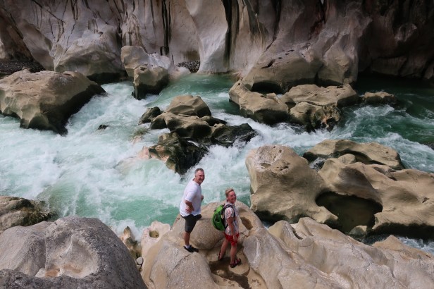 Vejen mod Tinipak standser ved en flod, hvor man for 5 peso pr. person bliver staget over. På den anden side holder der tricycles, der for 60 peso kørte os op til en by med ca. 3.000 indbyggere, hvor vi blev registreret, betalte entre til nationalparken og blev udstyret med en guide, der skulle følge os. Det var en super fin tur på i alt 6,5 km langs floden, der løber igennem et bjergområde af kalksten, så flodvandet har den smukkeste isblå og grønne farve.