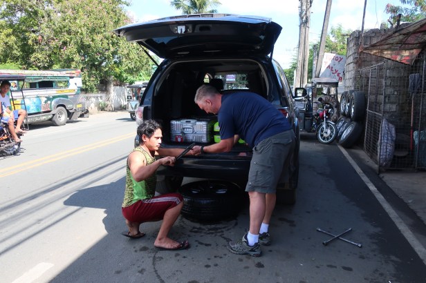 Inden vi forlod hotellet i morges for at køre videre nord og øst omkring Laguna de Bay, nåede vi lige at punktere på hotellets parkeringsplads. Som det vist altid er i Filippinerne stod der straks tre af de mandlige ansatte og en halvstor dreng, der alle i forening og lidt forvirring gav sig i kast med at skifte hjul på bilen. De kom dog lidt til kort, da det punkterede hjul ikke lod sig vriste fri, men et veltilrettelagt spark fra Peter løste problemet. En gang imellem er det en fordel at være en høj dansker med rigtige sko på.