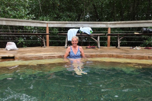 D. 14. februar regnede det om formiddagen, så vi nøjedes med at køre nogle få km uden for Coron for at se nogle varme kilder. Stedet var overraskende velorganiseret for Filippinerne, med pæne omklædningsfaciliteter, bænke og opmurede bassiner med 35-41 grader varmt vand. Det lyder måske ikke af alverden, men det var nærmest kvalmende at svømme de ca. 20 meter på tværs af det største bassin.
