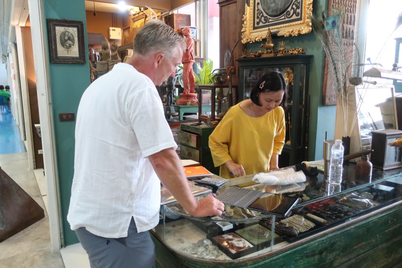 I et sidste forsøg på at finde en antikvitetshandler, der kunne ligge inde med en kniv til Peters samling, skrev vi “antique” på vores yndlings-app, maps.me, og så lykkedes det endelig. Det sendte os ud til weekendmarkedet, der begribeligvis ikke har åbent om torsdagen, men overfor ligger en stor bygning, hvor en helt masse antikvitetsforretninger holder til. I en af de sidste forretninger på 2. sal var heldet endelig med os, for vi fandt en butik med mange forskellige knive, hvor Peter endte med at købe to.