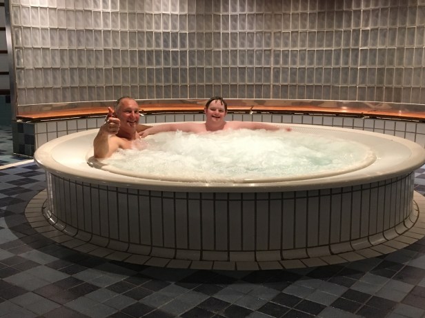 Tilbage på båden købte Anders et par nye badebukser, så han og Peter kunne hvile ud i den varme jacuzzi. Det var velfortjent efter 8 km gåtur.
