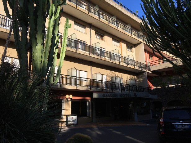 Garden Hotel i Catania, der minder mere om beton end en have. Det er et stort hotel, som formentlig har været rigtig fint engang, men nu er det slidt, og der bliver vist ikke brugt mange penge på vedligehold. Da vi boede der sidste år, var kun den ene elevator i drift, og det har det forgangne år ikke ændret på.