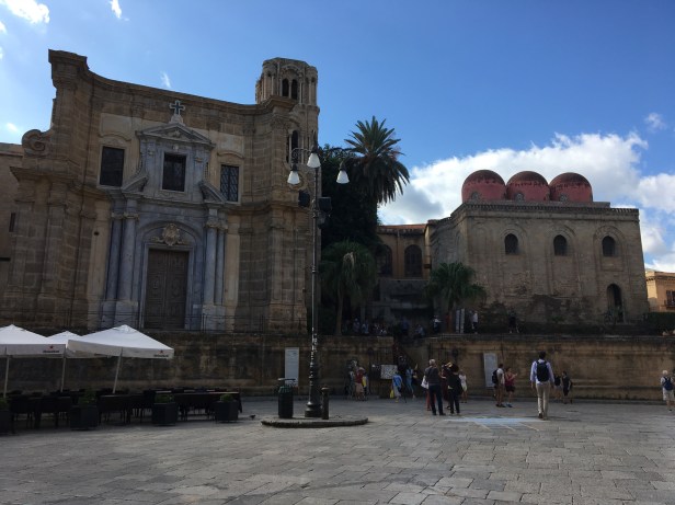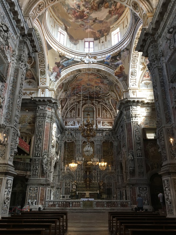 Torsdag kørte vi til Palermo, som vores guidebog beskriver i rosende toner. Der var bestemt masser af fantastiske bygninger og forretninger, men generelt var vi temmeligt skuffede. Byen har slet ikke samme charme som Catania; den virker meget forfalden og beskidt. Men vi var inde at se en meget smuk og overdådigt dekoreret kirke, Santa Catarina, der lå på et torv, hvor der var flere andre kirker og en moske – kirker er der rigeligt af alle vegne.