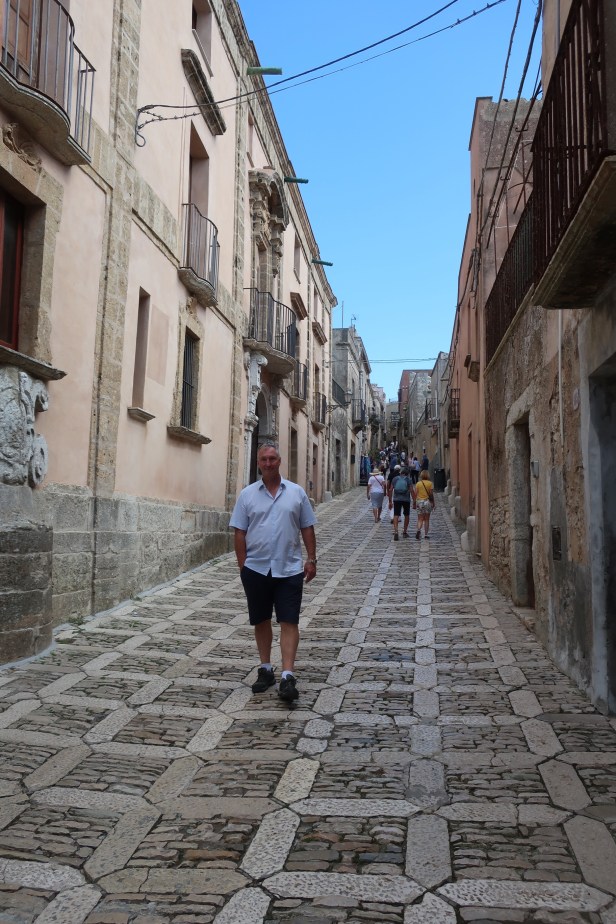 Lørdag d. 28. september kørte vi ud til vestkysten til byen Trapani. Herfra er der svævebane op til en lille middelalderlandsby, der hedder Erice. Turen er på 3 km, og man bliver hævet 800 meter op til det bjergplateau, hvor Erice ligger bag sin bymur. Byen er velholdt og især vejbelægningen, der stort set var ens i hele byen imponerede os.