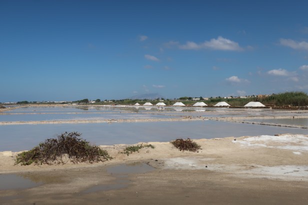 Vestkysten af Sicilien er kendt for sin indvinding af middelhavssalt, så vi forsøgte at komme ind at se en fabrik. Men billetdamen var vist gået til frokost, så vi nøjedes med at gå lidt rundt og kigge på de inddæmmede damme med havvand og de hvide dynger med inddampet salt. Efter at have set saltsyderiet på Læsø, var det her noget af en skuffelse, og saltkrystallerne var ikke engang flotte som Læsøs jomfrusalt.