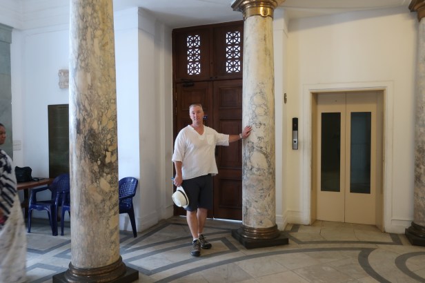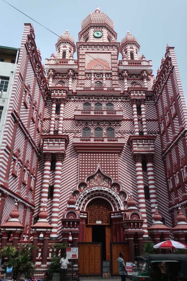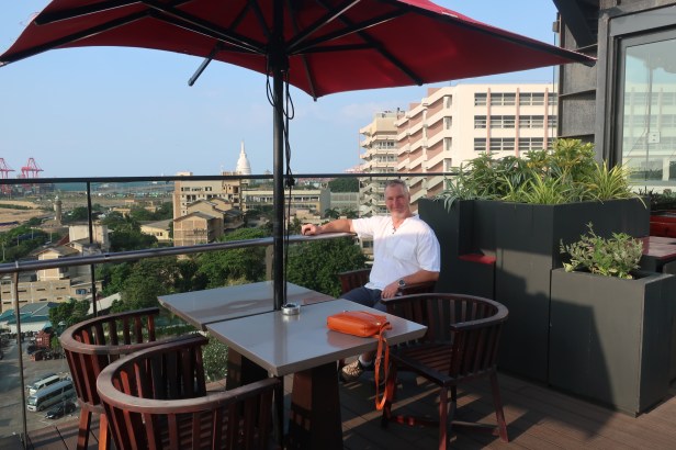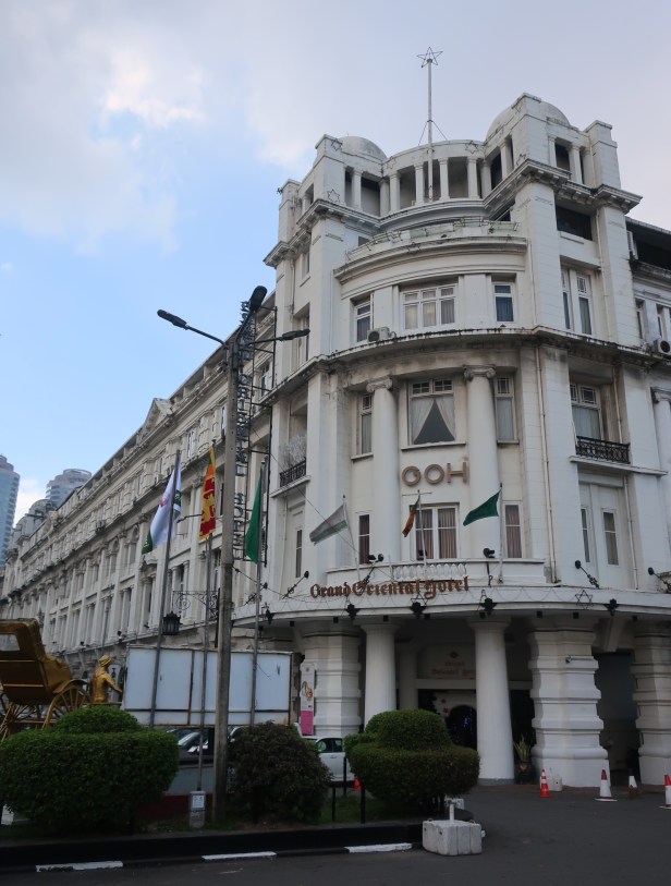 Ved hjælp af app’en maps.me, som vi slet ikke kan undvære, hjalp vi vores taxachauffør med at finde vej til vores hotel, Grand Oriental Hotel, der er landets ældste. Det ligger i den gamle del af Colombo indenfor det gamle forts område, der blev bygget af hollænderne, men siden er blevet revet ned for at give plads til, at byen kunne vokse. Fra hotellets restaurant ser man lige ud på byens store containerhavn, og der er liv døgnet rundt. Hotellet er mildt sagt temmelig slidt, og der lugter hengemt og fugtigt, men det har et ‘swung’ af historiens vingeslag, og vi blev gratis opgraderet fra et standard dobbeltværelse til et deluxeværelse med masser af m2, så vi var godt tilfredse.