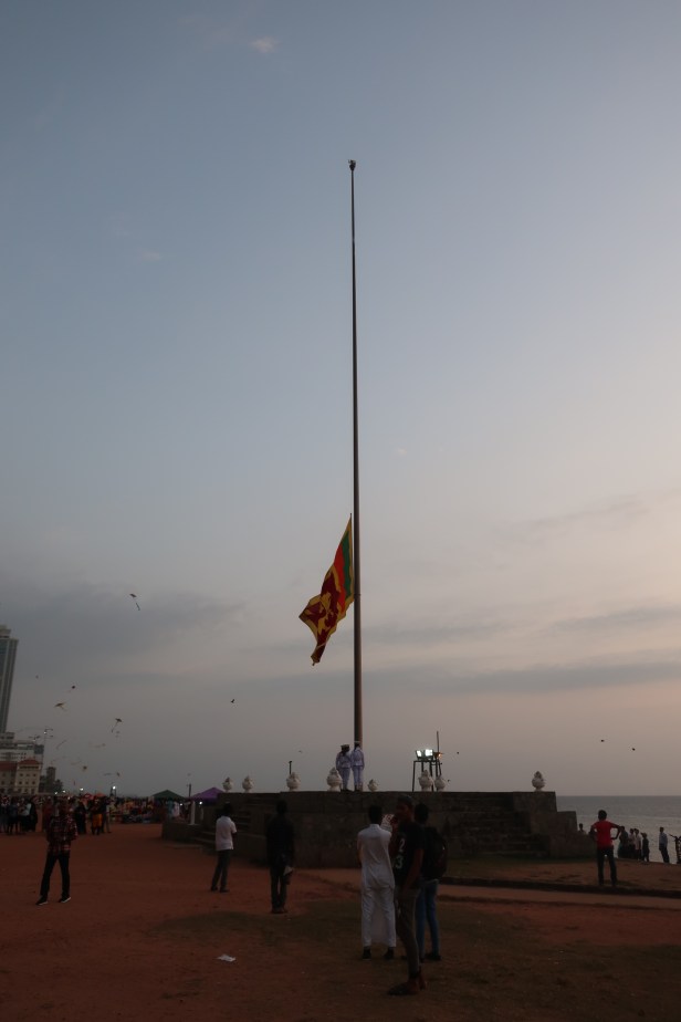 Bagefter gik vi mod syd langs vandet, hvor der ligger et grønt område, Galle Face Green, hvor byens indbyggere tager ned ved solnedgang for at spise, bade, sætte drager op, se flaget blive taget ned, spille cricket eller fodbold og alt muligt andet hyggeligt. Der er selvfølgelig en masse madboder, og vi købte også to ‘rejekager’, der smagte alt for meget af tørret fisk, så de røg i skraldespanden.