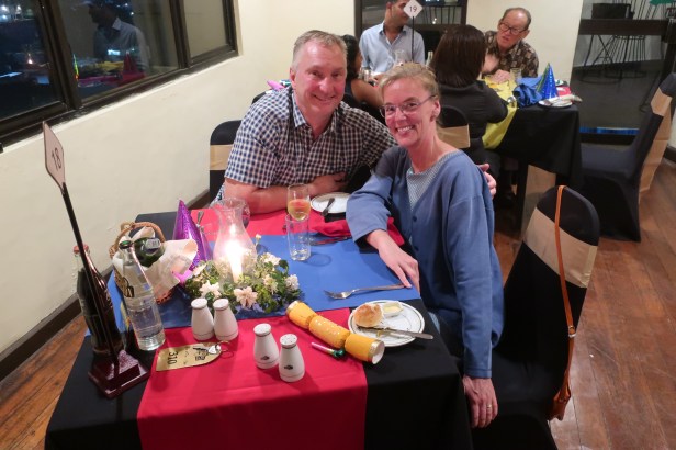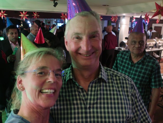 Nytårsaften på hotellet var præcis så anderledes, som vi havde håbet på. Gallamiddagen startede først kl. 20.30, og hele restauranten var fint pyntet med duge og servietter i alle mulige farver. På alle borde var der nytårsknallerter og paphatte, så ingen undskyldning for ikke at være i festhumør. På trods af Peters pæne nye bukser var vi klart de mest dagligdags at se på. Nu ved vi, at gallapåklædning i Sri Lanka for kvinders vedkommende betyder kropsnære kjoler i klare farver med pailletter og blankt stof over det hele, mens mænd kan nøjes med skjorter og jakker i klare farver med lidt guld- eller sølvsyninger her og der.