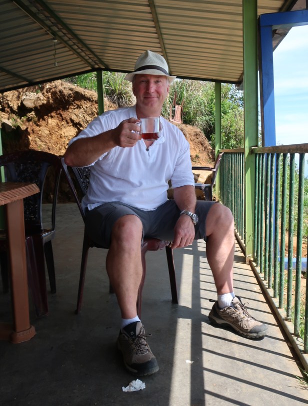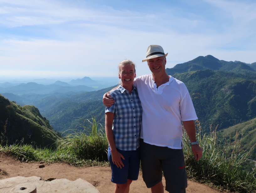 Manageren på vores hotel havde nævnt et sted, der hedder Lipton’s Seat, og da Lipton i Peters univers er lig med en god kop te, så skulle vi selvfølgelig se det. Vi tastede navnet ind på maps.me, og så begyndte ellers en helt skør køretur op igennem temarker. De sidste 10 km var vejen kun så bred som vores bil, men det betød ikke, at vi ikke mødte modkørende. I Sri Lanka er trafiklogikken sådan, at man hellere vil bruge 10 minutter på at snige sig forbi hinanden et sted, hvor der reelt ikke rigtigt er plads til, at fx en bil og en tuk-tuk kan passere hinanden, end at den ene bakker 20 meter ned til et sving, hvor der er bedre plads. Måske taber man karma-point, hvis man bruger sit bakgear? Da vi manglede ca. 5 km til toppen, blev vi indhentetaf en turist på motorcykel, så han kørte foran os, og fik sigaleret til de modkørende, så de stoppede, hvor der var plads til, at to biler kunne køre forbi hinanden. Udsigten fra toppen var klart turen værd, og vi fejrede det med to kopper Lipton-te og to samosaer. Og så kørte vi hele vejen ned igen.