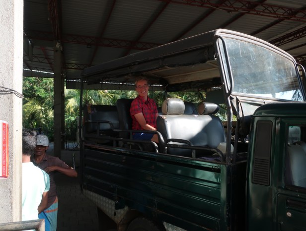 Man må ikke selv køre ind i nationalparken, men skal booke en tur med en særlig slags firhjulstrækker med sæder på ladet. Da vi nåede byen Tissamaharama 15 km fra parken, spejdede vi efter en ‘safari-tur-udbyder’, men blev selv spottet af en mand på motorcykel. Hvordan han kunne se, at vi var turister, fandt vi aldrig ud af, men i løbet af ingen tid var vi udstyret med en safaribil med chauffører, og så var vi på vej til Yala.
