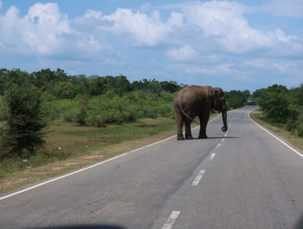 På vej tilbage til Ella kørte vi en lille omvej, så vi kørte på den landevej, der går tværs igennem Yala Nationalpark, og tre gange stod der pludselig en stor hanelefant midt på vejen. Sådan en har man lidt mere respekt for end en fasan.