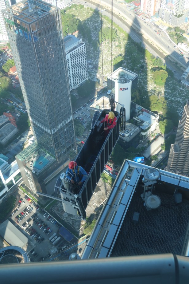Man kan ikke besøge Kuala Lumpur uden at tage op i Petronas Towers. Det er sat vældig fint i system, så man køber billet til et bestemt tidspunkt, og man kan booke flere dage frem. Der bliver sendt en gruppe af sted hvert kvarter fra kl. 8:30, og vi købte billetter til kl. 9:00. Første stop er på 42. etage, hvor der er en skybridge mellem de to tårne 170 meter over jorden. Der havde vi 10-15 minutter, inden turen gik op til 86. etage, hvor der er udsigt over hele byen 350 meter oppe. Det var præcis lige så vildt, som det lyder.