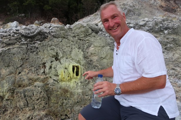 Der er ca. 1,2 km fra asfaltvejen op til ‘krateret’ ad en afmærket sti gennem tæt skov. Vi havde det helt for os selv, hvilket kun kan undre, for det var en helt unik oplevelse at se og lugte de mange svovlaflejringer, det vrimlede med.
