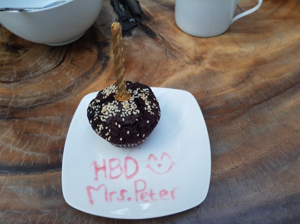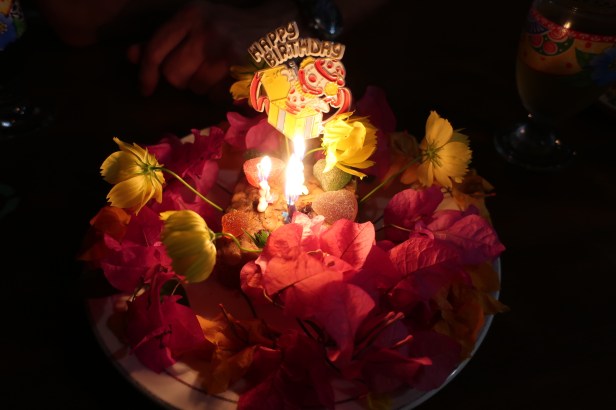 Tirsdag var det Camillas fødselsdag, og hun havde bestemt, at den skulle bruges til et besøg på vulkanen Jaboi og et vandfald, som vist ikke hedder noget. Men inden vi tog på vulkaner skulle vi have morgenmad, og Peter havde selvfølgelig rottet sig sammen med personalet, der havde lavet en fødselsdagsmuffin med lys og sang en fødselsdagssang som overraskelse.