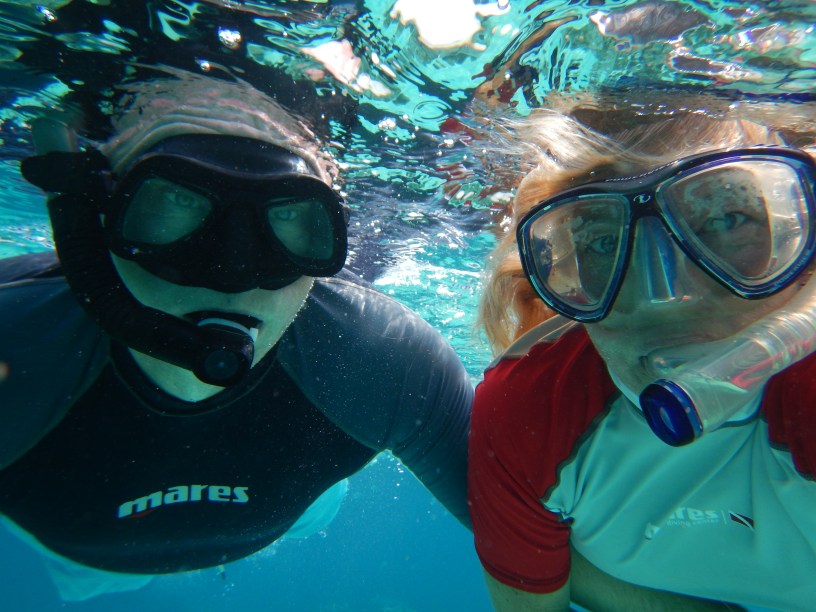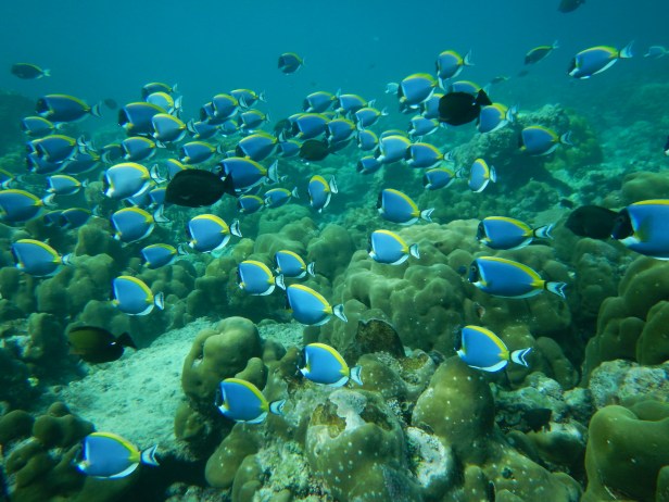 Hos Lumba Lumba anbefalede de, at vi kørte ud til øens vestkyst for at snorkle, og det var et godt råd, så vi snorklede der tre gange. Der var rigtigt fine koraller helt ind til kysten, og de var stort set ubeskadigede – formentlig fordi der næsten ingen turister var på den side af øen. Det vrimlede med fisk, og den ene dag så vi en skildpadde på omkring en meter, så selvom sigtbarheden ikke var specielt god, var der hele tiden masser at kigge på. Og man skal altså være meget blasert, hvis man ikke bliver imponeret over farver, form og mønstre på tropiske koralfisk.