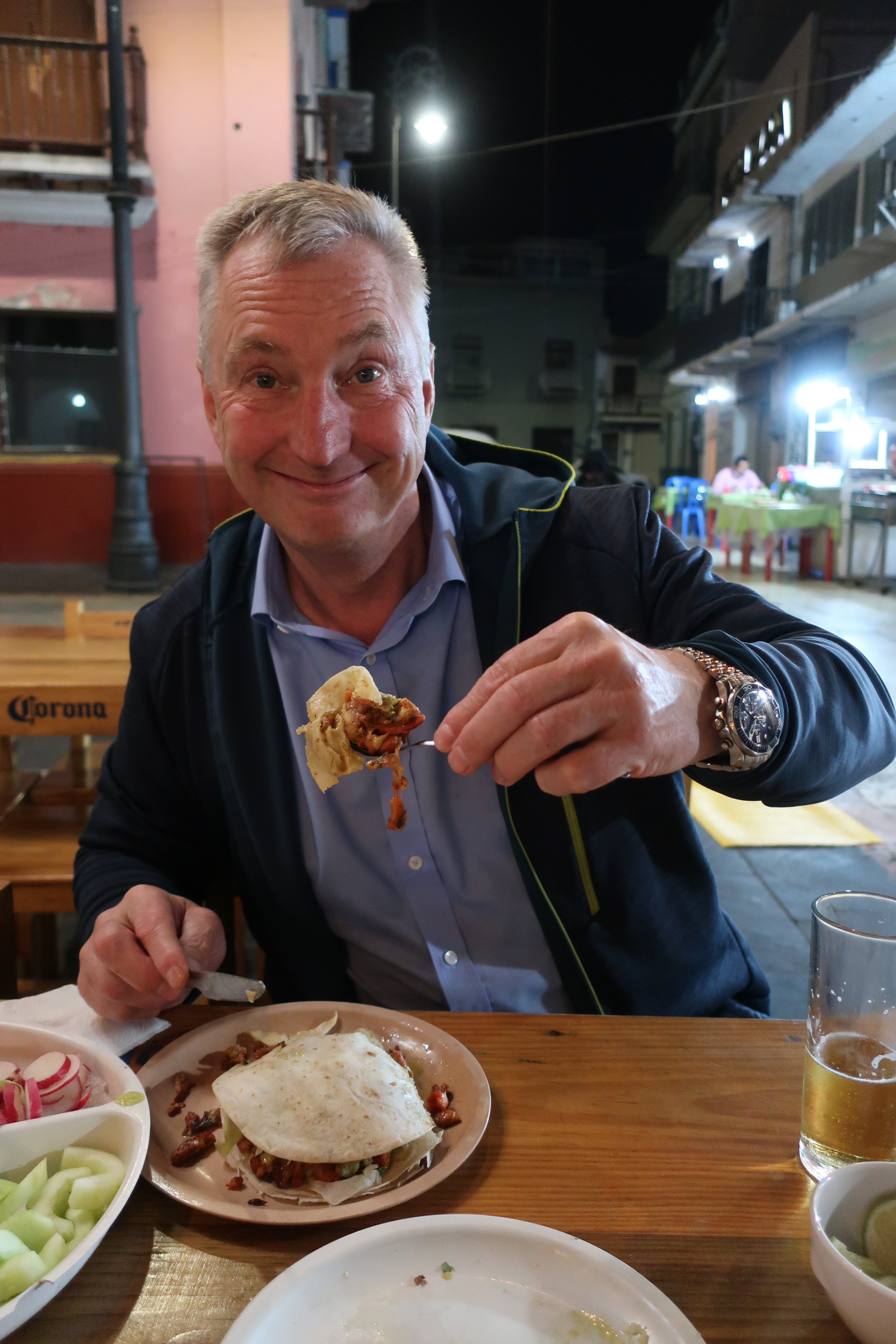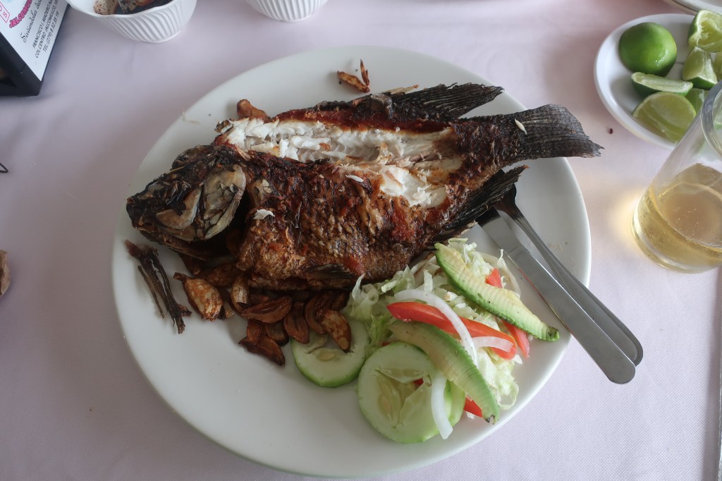 Frokosten indtog vi på en lokal restaurant, der serverede den lokale specialitet Mojarra enchipotlada, der skulle være en ørredlignende fisk med røget chilisovs. Billedet viser dog, at den mere ligner en aborre end en ørred. Smagen var dog ganske fortræffelig, og den havde heldigvis kun store fiskeben.