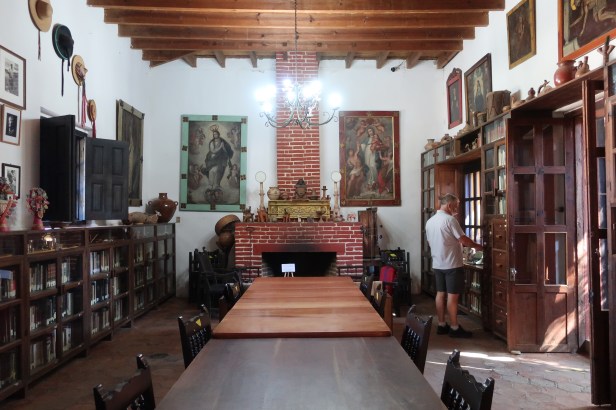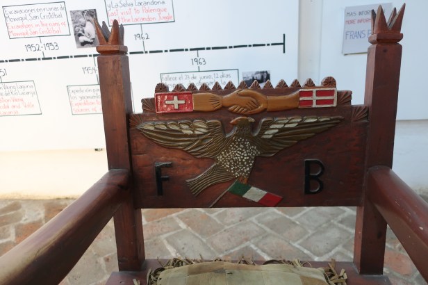 Gadebilledet er præget af gademusikanter (bedre standard end i Veracruz), gadehandlende (mayafolk) og skopudsere. En skopudsning koster mellem 15 og 30 pesos afhængig af skopudserens opfindsomhed, når du forhandler pris. Fx får Peter her pudset sko for 15 pesos, hvilket dog efterfølgende kostede 30, fordi den aftalte pris selvsagt kun var for én sko! (Det er hermed bevist, at en 10årig mexicansk knægt sagtens kan narre en 54årig europæer.) Da Peter fik pudset sko næste gang (det er den bedste måde at give ”ulandshjælp” på i stedet for bare at stikke dem nogle penge), blev det nøje aftalt, at prisen var for begge sko. (Det er hermed bevist, at en 54årig europæer lærer meget hurtigt.)Den første dag besøgte vi Na Bolom (Jaguar-huset). Det var tidligere privat hjem for et dansk-schweizisk ægtepar, der hed Frans og Gertrud Blom, og er nu museum. Frans Blom, der var født i 1898 i København, var arkæolog og har været med til at udgrave nogle af de vigtigste og største maya-ruiner i den centrale og østlige del af Mexico. Hans kone var fotograf og engagerede sig i at forbedre forholdene for mayaerne. Billedet viser ryglænet på Frans Bloms kontorstol med flagene fra både Danmark, Schweiz og Mexico.Når man et helt voksenliv beskæftiger sig med mayaernes kultur, får man naturligvis samlet nogle bøger sammen, og hr. og fru Bloms bibliotek rummer mere end 9.000 bind. Peter er her i gang med at pille i hr. Bloms kartotek.San Cristóbal har selvfølgelig også et stort marked, der ligger omkring den gamle kirke i centrum. Dette billede overdriver på ingen måde farveorgiet.