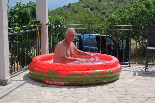 Den hytte, vi har lejet, ligger lidt oppe ad en bjergside mellem landsbyen Blagaj og den noget større by Mostar. Vi er rigtig glade for hyttens placering, for det betyder, at der næsten hele døgnet kommer vind nede fra dalen, så det lufter lidt på terrassen. Uden den vind ville vi helt sikkert smelte bort som dug for solen. På trods af vind og medbragt ventilator, der kører på højeste styrke med retning mod Peter, så snart vi er udenfor, så har det været nødvendigt at indkøbe et badebassin.