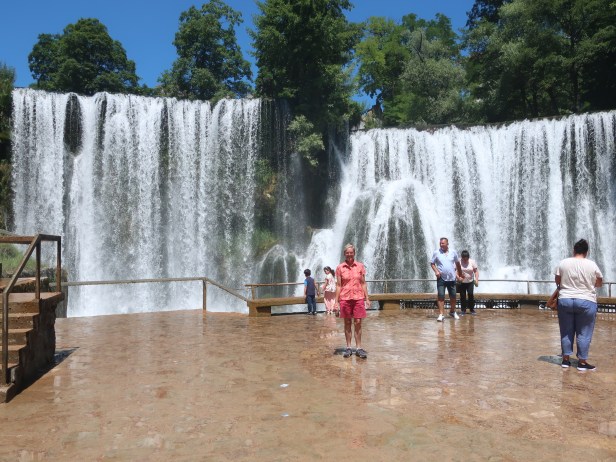 Vi havde hjemmefra booket to overnatninger i Banja Luka, der ligger i den nordlige del af Bosnien-Herzegovina og ca. 4 timers kørsel fra vores hytte. Det var en rigtig god køretur, hvor landskabet var meget forskelligt, men det, der kendetegner alle de steder, vi indtil videre har set, er, at der er floder og vand over det hele. På vejen derop gjorde vi holdt ved byen Jajce, der som rigtigt mange andre byer, er præget af byggeri fra Osmannerriget. Byen er placeret ved floden Pliva, der har et meget smukt vandfald, som vi gerne ville se.