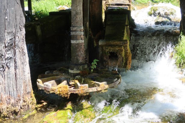 Vandmøllehul behøver ikke at være lodrette, som vi bedst kender dem i Danmark. Her ses det vandrette drivhjul og den lodrette aksel direkte op til møllestenen.