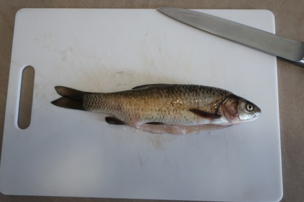 Vores første og hidtil eneste fangst. En ca. 20 cm lang fisk af ukendt art fanget af Camilla med en bid dej æltet af Peter på en krog med bobbelflåd. Den havde rigtig mange ben og smagte ikke af noget særligt, så vi er på udkig efter et fiskested, hvor vi kan fange ørreder i stedet.