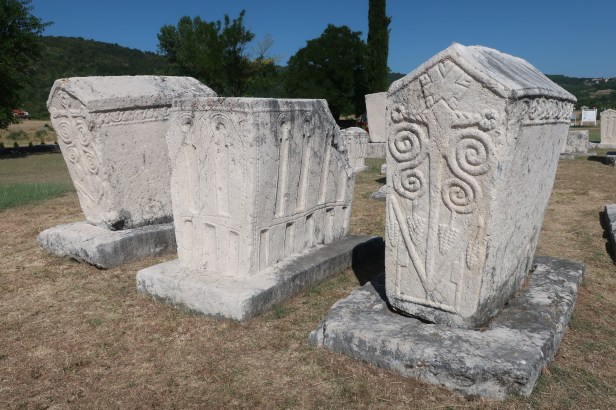 Spredt over det meste af Bosnien-Herzegovina er der nogle gamle kirkegårde fra middelalderen, der hernede bliver betegnet som nekropoliser. Det er nogle ganske store gravsten med udhugninger og relieffer, og de fineste har inskriptioner, der tydeligt fortæller, hvem der er stedet til hvile. En af landets største samlinger (ca. 135 sten) ligger ca. 30 minutters kørsel fra vores hytte, så dem kørte vi ned for at se i går.