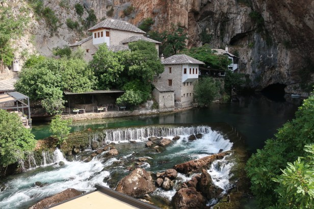 Landsbyen Blagaj er kendt for to seværdigheder, og som alle kan se af ovenstående billede, er den ene ikke til at komme udenom. Floden Buna udspringer af bjerget i baggrunden, og det er en meget imponerende mængde vand, der kommer farende ud af klippen. Da osmannerne erobrede området, gjorde de Mostar til den vigtige administrationsby, mens Blagaj blev stedet, hvor de byggede dette smukke kloster. Og det er præcis lige så postkort-smukt at stå der, som det ser ud på billedet. Vi fulgte selvfølgelig alle skiltene og endte med at betale 2 x 10 Mark (80 kr.) for at komme ind på klosterets område, hvilket er mere end dobbelt så meget, som vi har betalt i entre noget andet sted i landet. Lad være med det! Den flotte udsigt foregår på den anden side, og det er rørende gratis.