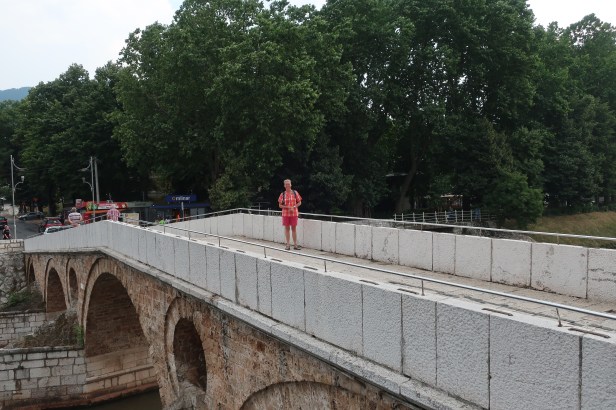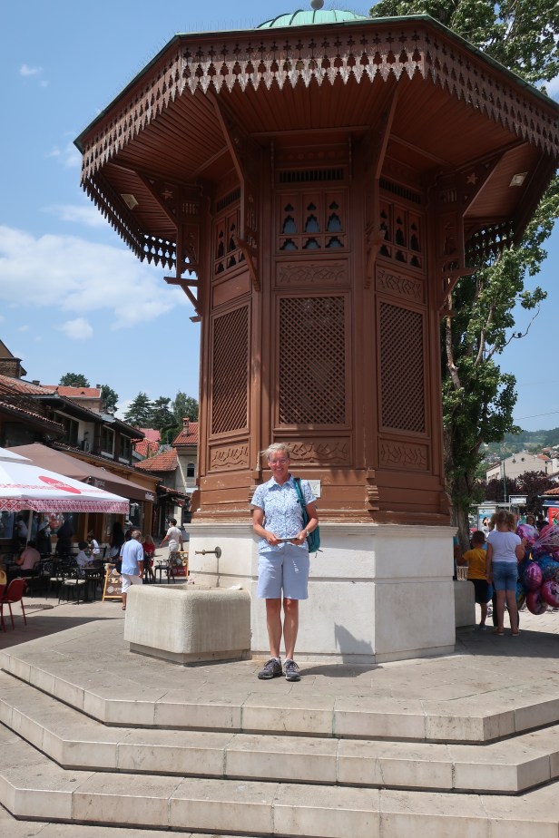 Vi er lige kommet tilbage til vores hytte i Blagaj efter tre dage i hovedstaden, Sarajevo. Som så mange andre byer i Bosnien-Herzegovina ligger Sarajevo ved en flod, og så breder byen sig op ad bjergsiderne på begge sider af floden. Det er IKKE en by, hvor man ser mange cykler, og man skal ikke gå særligt langt for at få trætte ben, for gaderne er stejle. Vores hotel lå omkring 500 meter fra den fontæne, der er en af byens største attraktioner, og på de 500 meter flyttede vi os 60 højdemeter. Til gengæld er næsten alle gader meget smalle (tænk syditaliensk landsby), men selvfølgelig ikke ensrettede, så det er rigtig spændende at komme rundt om et hjørne på en vej med 15% stigning i en Ford Transit og møde en modkørende hvid VW Golf årgang cirka 1992.