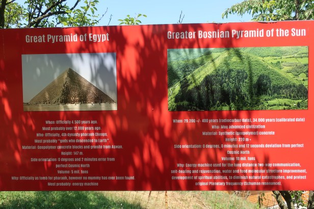 Selvom stort set de fleste eksperter indenfor området har afvist, at de trekantede forekomster omkring landsbyen Visoko er menneskeskabte, så har ‘de troende’ i hvert fald været gode til at lave nogle overbevisende skilte på vej op ad pyramidens basis. Vi har taget et par af de menneskeskabte ‘betonstykker’, der ifølge skiltene er mere end 30.000 år gamle, og da vi viste dem til en af guiderne og manden i billetkontoret, så sagde de, at dem måtte vi da hjertens gerne tage med til Danmark som en souvenir. Sådan er det hverken i Egypten eller Mexico, når man besøger deres pyramider, så man kan sige, at man i Bosnien-Herzegovina får væsentligt mere for sin entre.