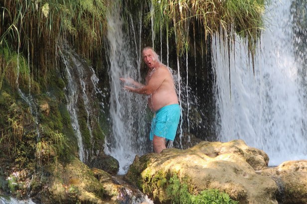 Selvom det er rart at blive kølet ned, når temperaturen nærmer sig de 38 grader, så er vandet i Kravica-vandfaldet nok lidt til den kølige side, som Peters ansigtsudtryk vist meget godt viser.