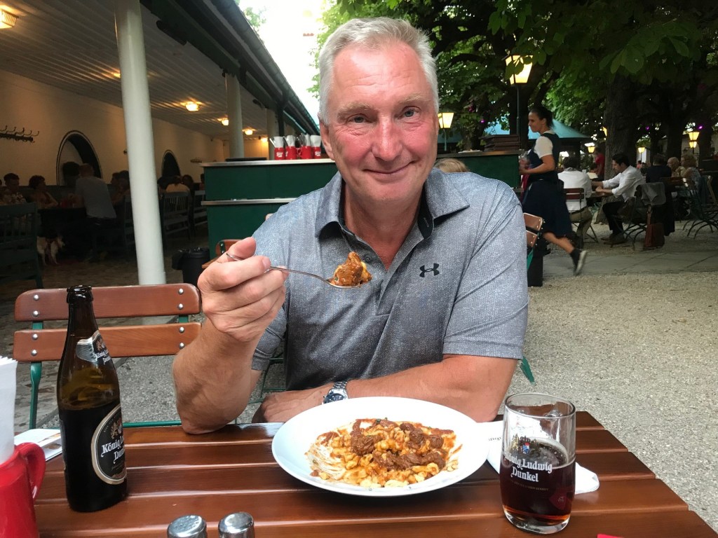 Hjemturen bed vi over i to, så vi havde en overnatning i Linz i Østrig. Det var Peter bestemt ikke utilfreds med, for vi fandt en restaurant, der kunne byde på wurstsalat til forret, gullasch med spätzle (alpe-pasta) til hovedret og dunkelbier til at skylle efter med. En god afslutning på en god ferie.