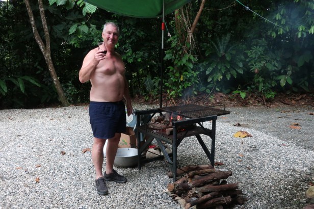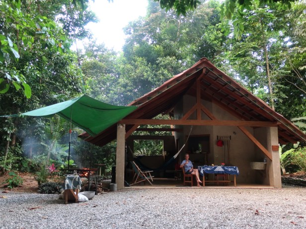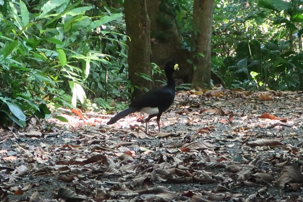 Vi var indlogeret på Puri Mas i den uge, vi boede på Osa-halvøen. Det er et lille hotel (2 hytter) ejet af et ægtepar fra Belgien. Hotellet ligger inde midt på halvøen, og ægteparret har købt 22 ha oprindelig skov, som har et meget rigt dyreliv. Vi blev vækket af skræppen fra flere ara-par og tukaner, og når vi sad og spiste morgenmad, havde vi selskab af store, metalblå sommerfugle og fine, små kolibrier.De fleste eftermiddage fik vi besøg af enten denne piphans eller hans mage. På dansk hedder det en Stor Hokko, og ifølge Aalborg Zoo’s hjemmeside tilhører den hønsefamilien. Den er næsten en meter høj og har sjove krøllede fjer i en “hanekam” på hovedet.Eftersom vi boede ude midt i ingenting, og der var langt til den nærmeste pølsevogn, lavede vi selv aftensmad alle dage. Peter stod for grillen, og Camilla lavede salat, så bortset fra temperaturerne og de eksotiske fugle, så mindede det meget om vores weekender i Sverige.