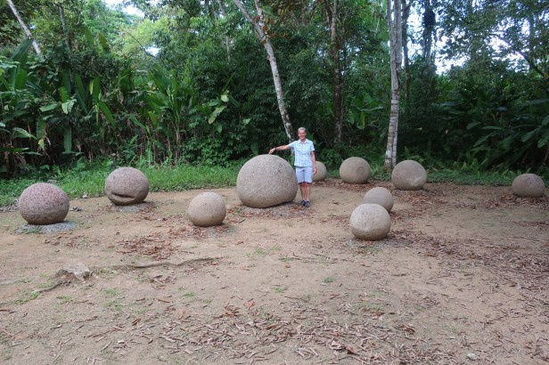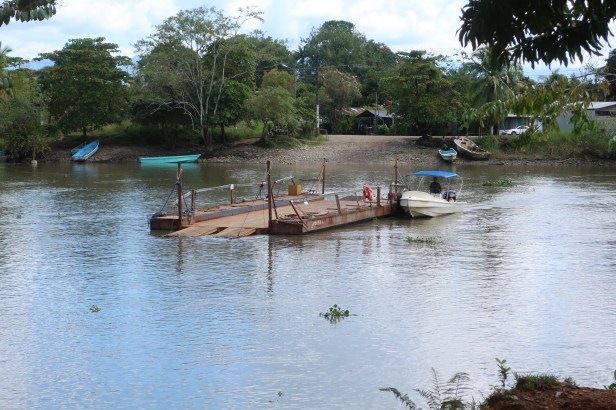 Som afslutning på den helt forfærdelige grus-/hulvej skulle vi med denne lille bilfærge over Sierpe-floden. Den var rusten og slidt, men turen kostede stadig 5.000 colones = 50 kroner.Fordi vi var kørt udenom alting på vejen op til Uvita, kom vi forbi et lille museum, der er en afdeling af Costa Ricas Nationalmuseum. Det måtte vi se! Det havde åbenbart været store arkæologiske udgravninger af en bosættelse fra før Columbus/spaniernes erobring af Mellemamerika, men så vidt vi kunne se, havde de dækket det meste til igen. Essensen af civilisationen har dog åbenbart været en trang til at udhugge kugler af granitsten, der har været brugt som dels statussymboler og dels via deres placeringer i forhold til hinanden en slags kalender. Det bedste ved besøget på museet udenfor landsbyen Sierpe var, at vi fik set Dødningehovedaber (på engelsk hedder de Squirrel Monkey/Egernaber, hvilket er noget mere venligt). De er små, charmerende, vævre og lige til at blive glad af. Desværre er de i voldsom tilbagegang, så vi føler os faktisk heldige, at vi har fået set dem.