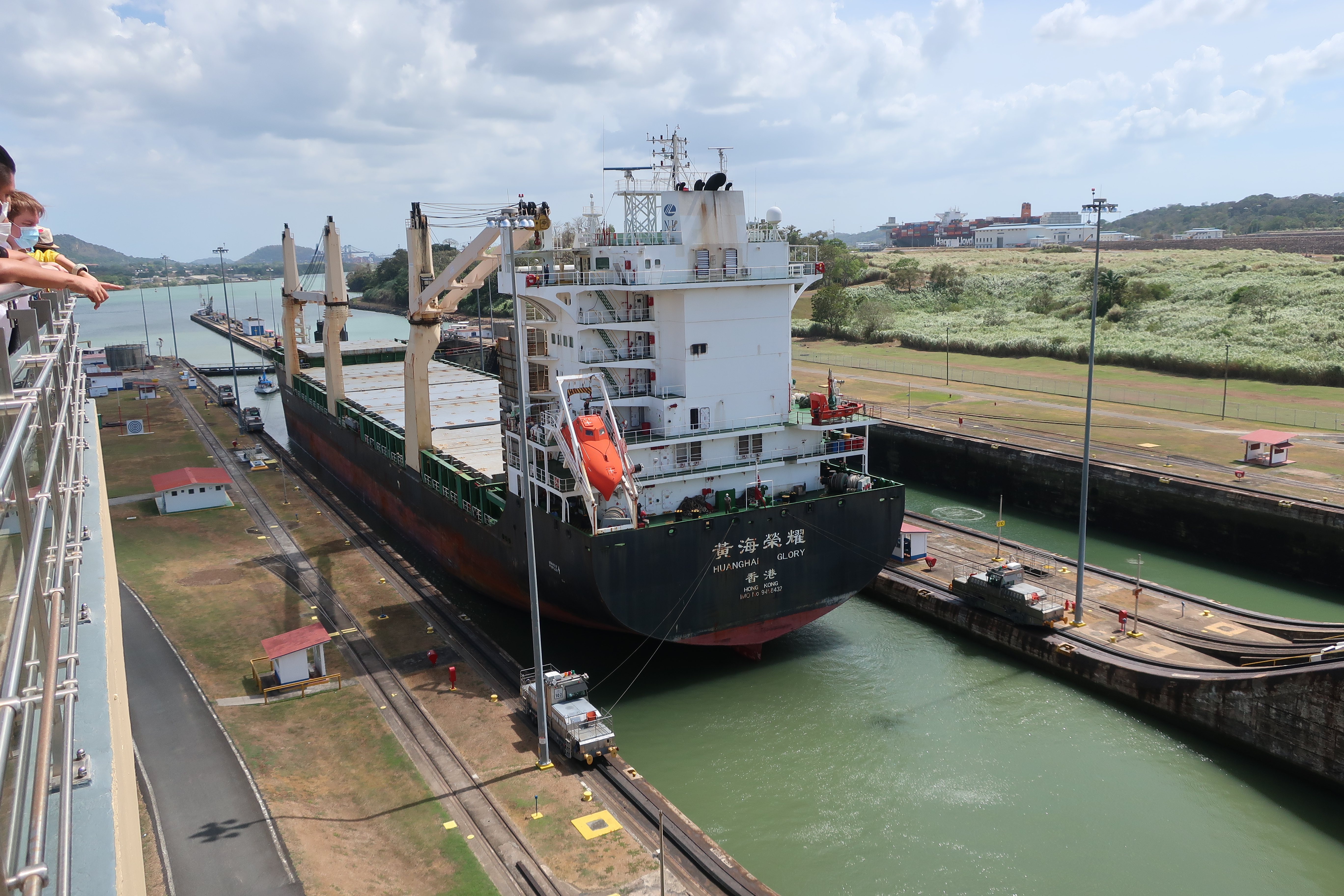Dette kinesiske skib er på vej mod Det Caribiske Hav. Der er seks specialbyggede lokomotiver – tre på hver side – der ved hjælp af wire sørger for, at skibet holder sig midt i sejlrenden (vi kan jo alle huske, hvad der skete i Suezkanalen, da et skib lagde sig på tværs for ikke så længe siden). Foran det store fragtskib ligger to “små” sejlbåde, der kom med i samme ombæring. Skibene betaler for passagen gennem kanalen på baggrund af vægt. Det mindste beløb, der nogen sinde er betalt, er $0,36, da en amerikaner i 1936 svømmede hele vejen fra kyst til kyst gennem kanalen.