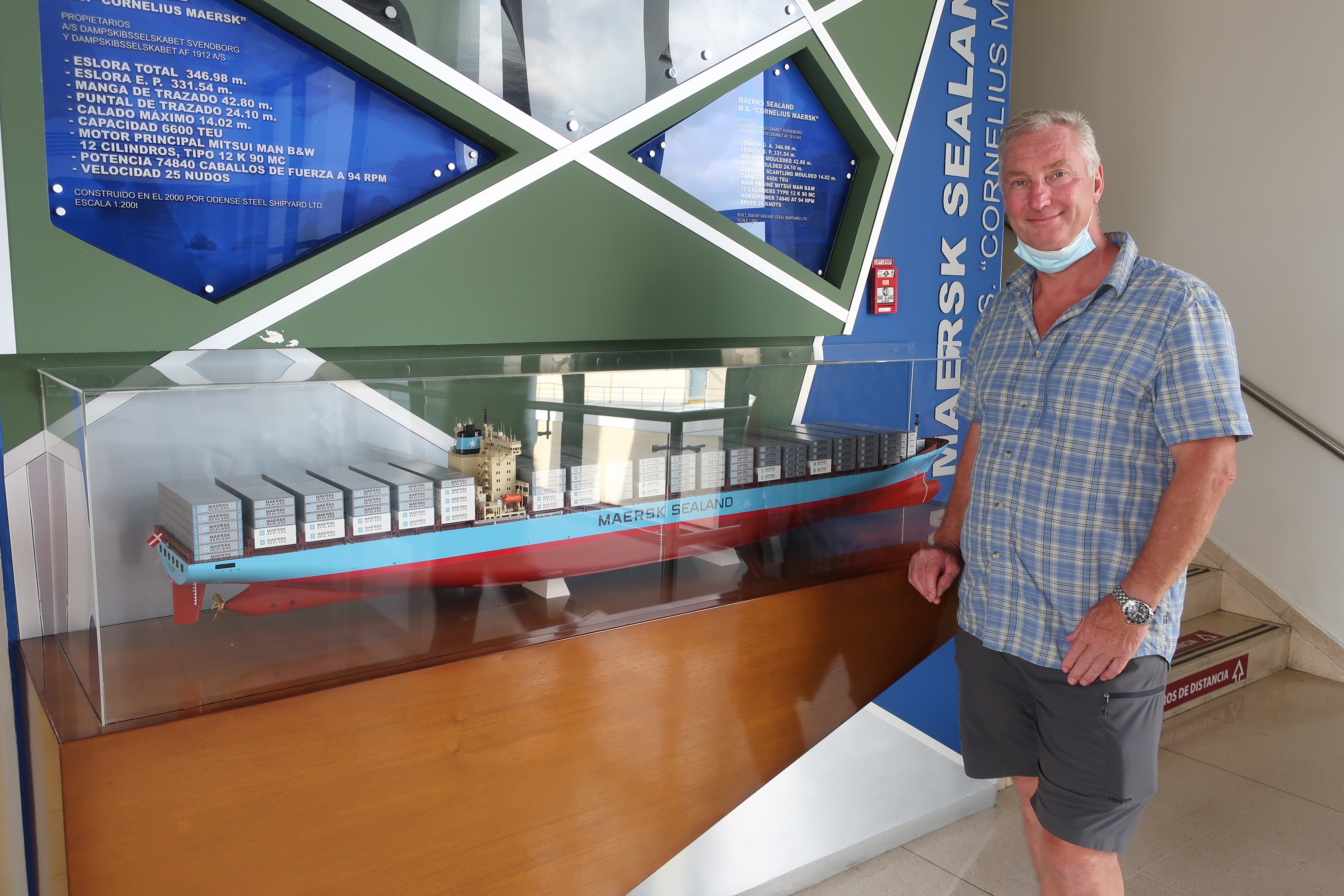 Det kan godt være, at vi ikke fik set et Mærsk-skib i kanalen, men der var massevis af Mærks-containere alle vegne, og i trappeopgangen ved udkigsplatformen ved 2. sluse stod dette store, flotte modelskib. Så bliver man da lidt stolt over at være fra Danmark.