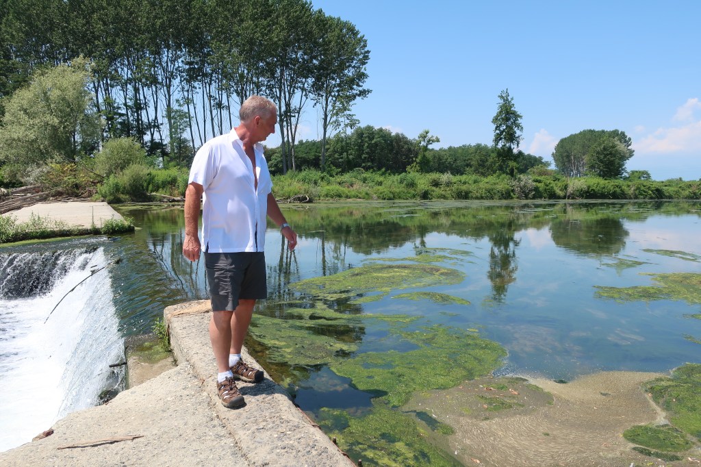 De ældste dele af klosteret er fra 1067, men sit nuværende udseende fik det i 14-1500tallet. Det koster gratis at komme ind at se det hele, og vi fik oven i købet en fin brochure på engelsk, som vi heller ikke skulle betale for. Efter en lang vinterrejse i Costa Rica, hvor INTET koster mindre end $10 var vi helt fortumlede over, hvor meget arkitektonisk skønhed vi fik kastet lige i synet for ingen penge overhovedet. Hurra for Europa (må man sige det, eller er der nu nogen, der bliver krænket?).Vi er havnet i et af Italiens spisekamre med masser af marker med hvede (der er høstet), majs, grøntsager af alverdens slags, vin (Nebiolo og Barolo især) og de førnævnte hasselnødder. Al denne overflod kan kun lade sig gøre, fordi området gennemskæres af diverse floder, hvor Po naturligvis er den vigtigste. Her kigger Peter efter et muligt fiskested, men vi må nok erkende, at floderne her bliver brugt kommercielt til enten vanding eller vandkraft, så hvis vi skal have held med vores medbragte fiskestænger, skal vi længere op mod Alperne.