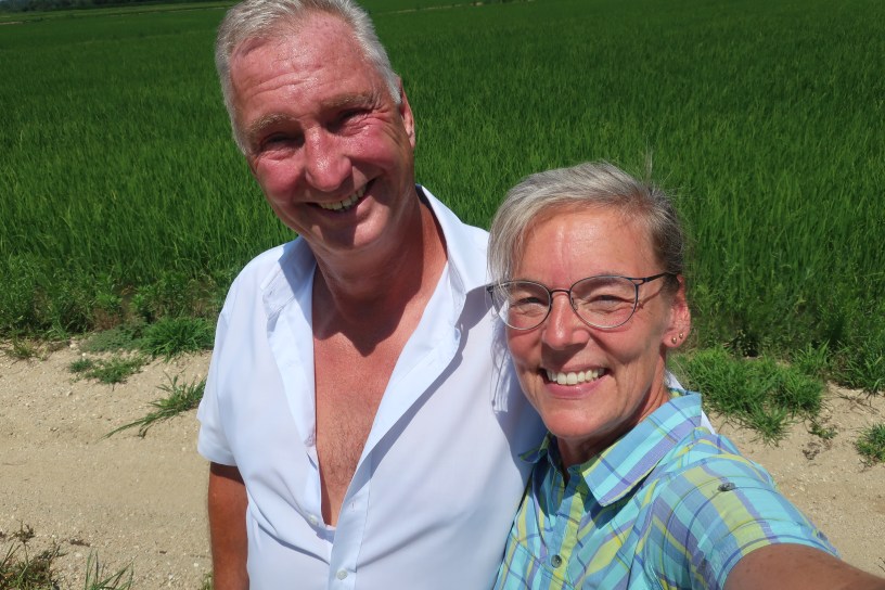 Vi ankom kl. 9 i går morges, hvor temperaturen var tålelig, men i dag siger termometeret 36 grader, så vi har indkøbt 15 meter forlængerledning, så den ene ventilator kan følges med Peter ud på terrassen.