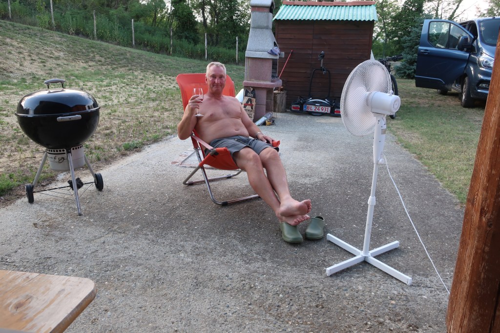 Peter i sit rette element på sommerferie i Norditalien sammen med sine tre bedste venner: Weber-grillen, en ventilator på fuld tryk og nye, fine crocks fra svigermor.