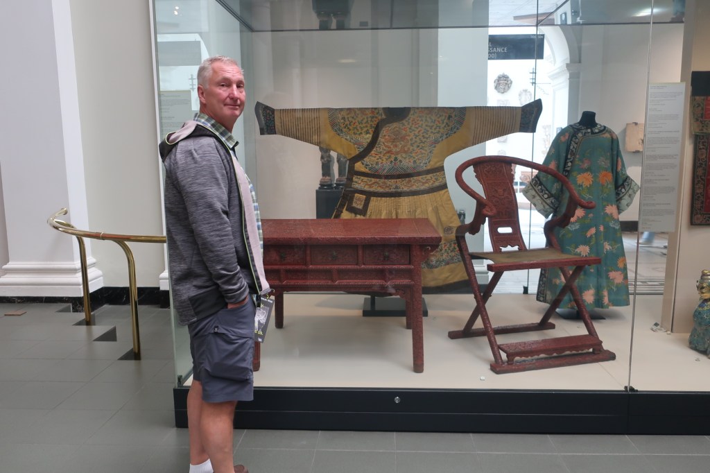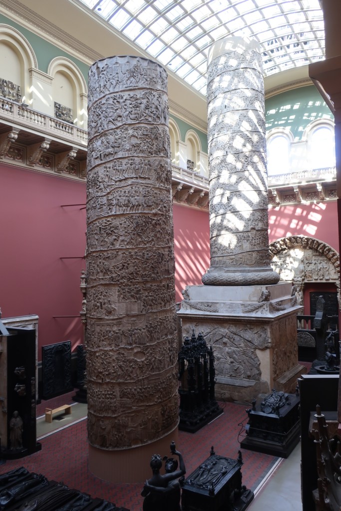 Vi startede med at gå igennem de sydøstasiatiske samlinger. Her står Peter foran en kinesisk, kejserlig sommerkimono fra 1800-tallet, imens vi stadig havde energi til at koncentrere os om de enkelte genstande og læse den udmærkede skiltning. Efter to timer var vi så fyldte af indtryk, at det var svært at blive ved med at bruge den samme tid foran de udstillede genstande, og vi havde stadig kun set en lille del af museet, så resten må vi have til gode til en anden gang. En gangbro på 2. etage fra afdelingen med støbejern til afdelingen med noget helt andet gav os dette kig ned til en afdeling med bl.a. denne imponerende afstøbning af Trajans Søjle, der står i Rom.