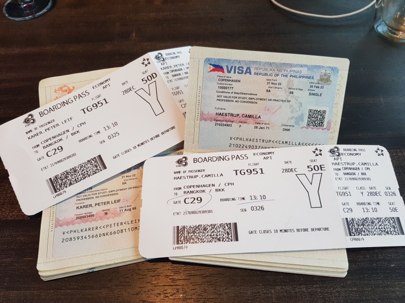 Så er vi klar. Helt klar! Vores visa til Filippinerne er på plads, og flyet til Bangkok letter om en times tid. Det bliver godt at bytte dansk decemberregn ud med sol & varme; vores vinterblege ben trænger i hvert fald til at gå i shorts i et par måneder.