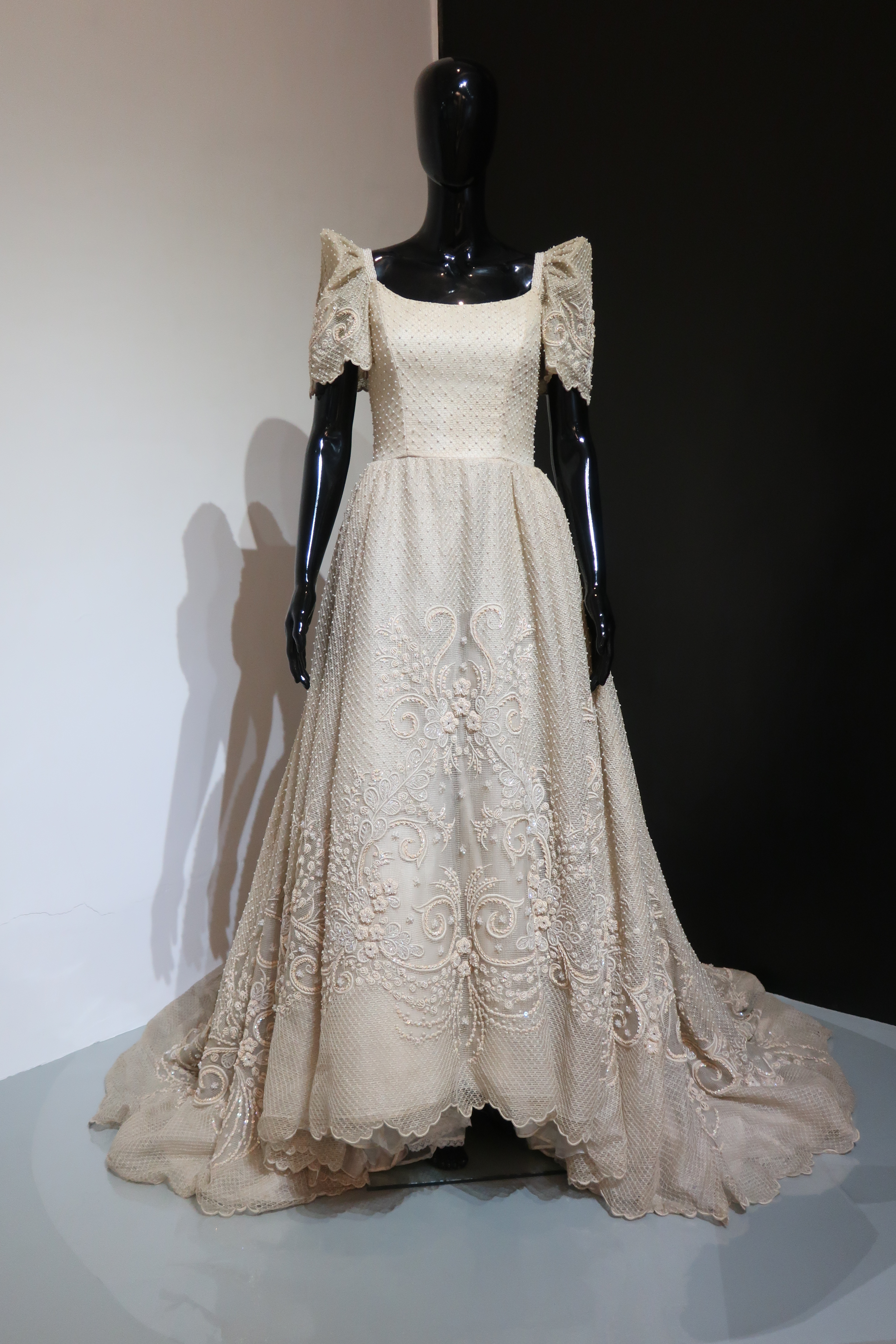 Hvor er brudekjolen imponerende. Ærmerne ligner lidt de ærmer, som Imelda Markos brugte på alle sine kjoler. Stoffet er helt eventyrligt – måske hedder det ikke stof, men vævede frugtfibre. Det må være et stort offer for bruden, at donere sin smukke kjole, det ville jeg aldrig kunne gøre.