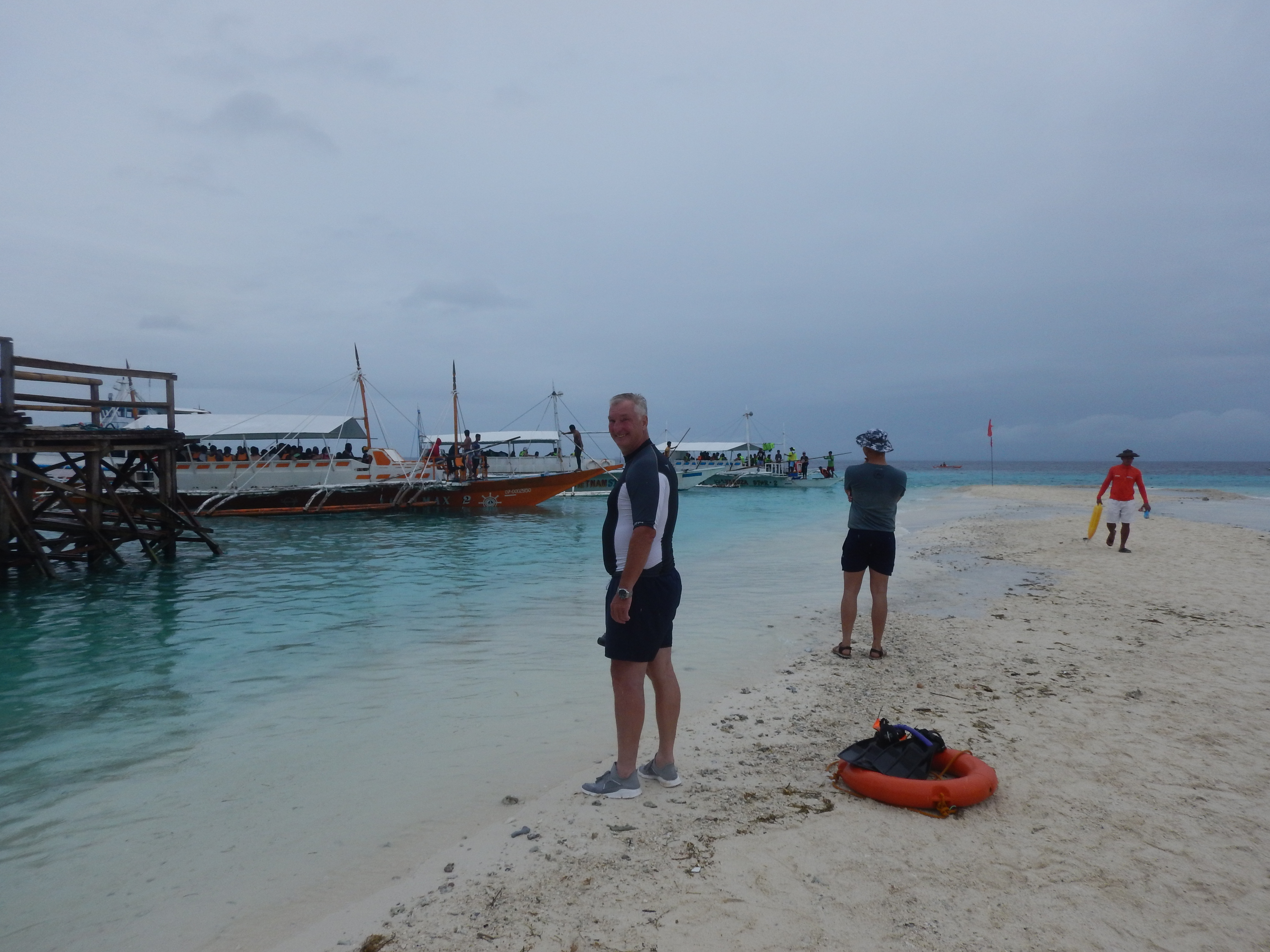 Når det regner, er det oplagt at snorkle, for man kan jo kun blive gennemblødt én gang. Der var fine koraller at snorkle på to steder rundt om den lille ø, men ud for denne sandbanke måtte vi kun snorkle sammen med en guide, der kostede 350 php (50 dkr). Han lod os til gengæld snorkle lidt udenfor det afmærkede område, hvor vi var heldige at se en hvidtippet haj.