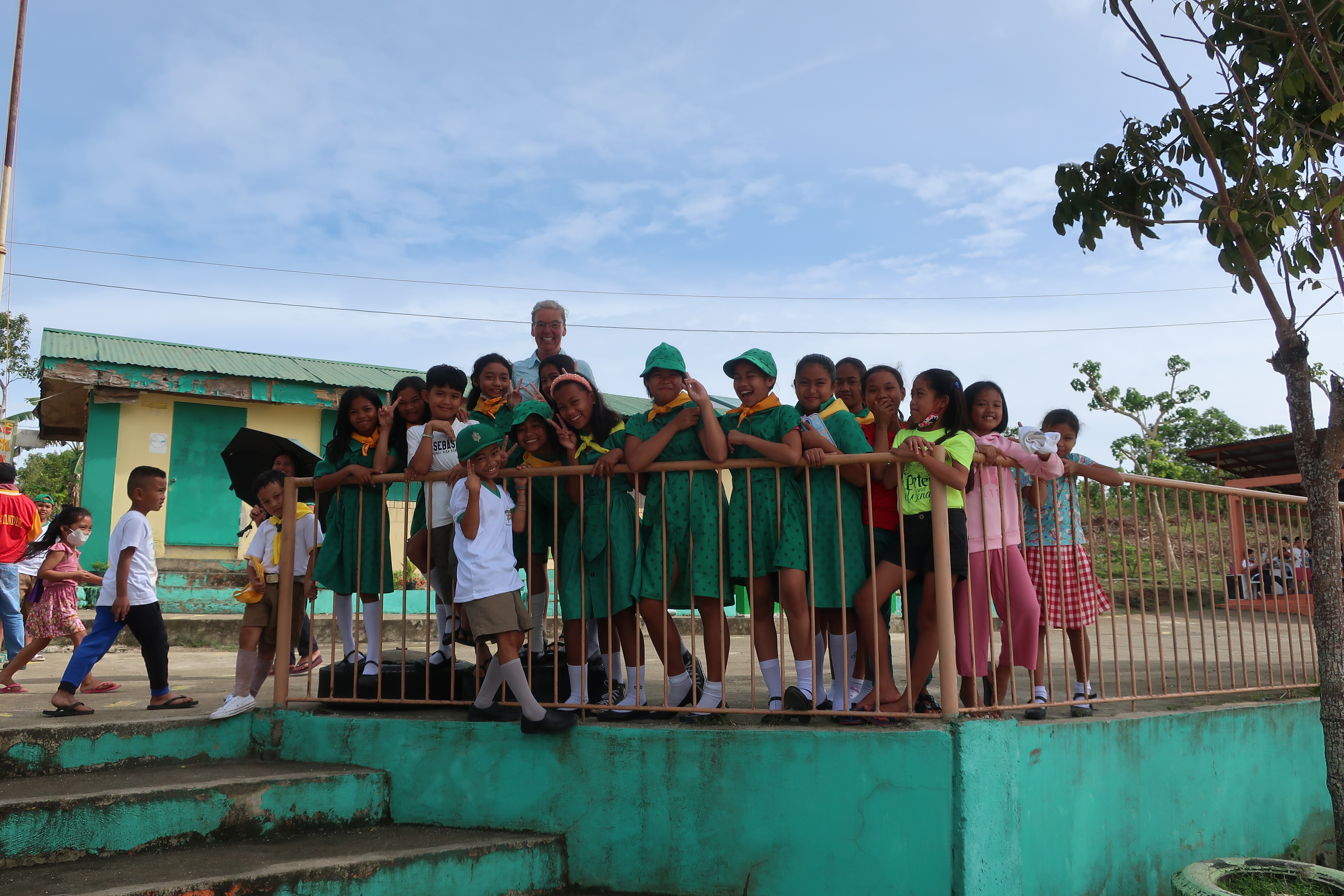 Vi kom bl.a. forbi en lille skole, der egentlig var i gang med flaghejsningsceremonien, men vi var vist lidt mere spændende, så det var ikke svært at få et godt billede sammen med en masse glade børn.