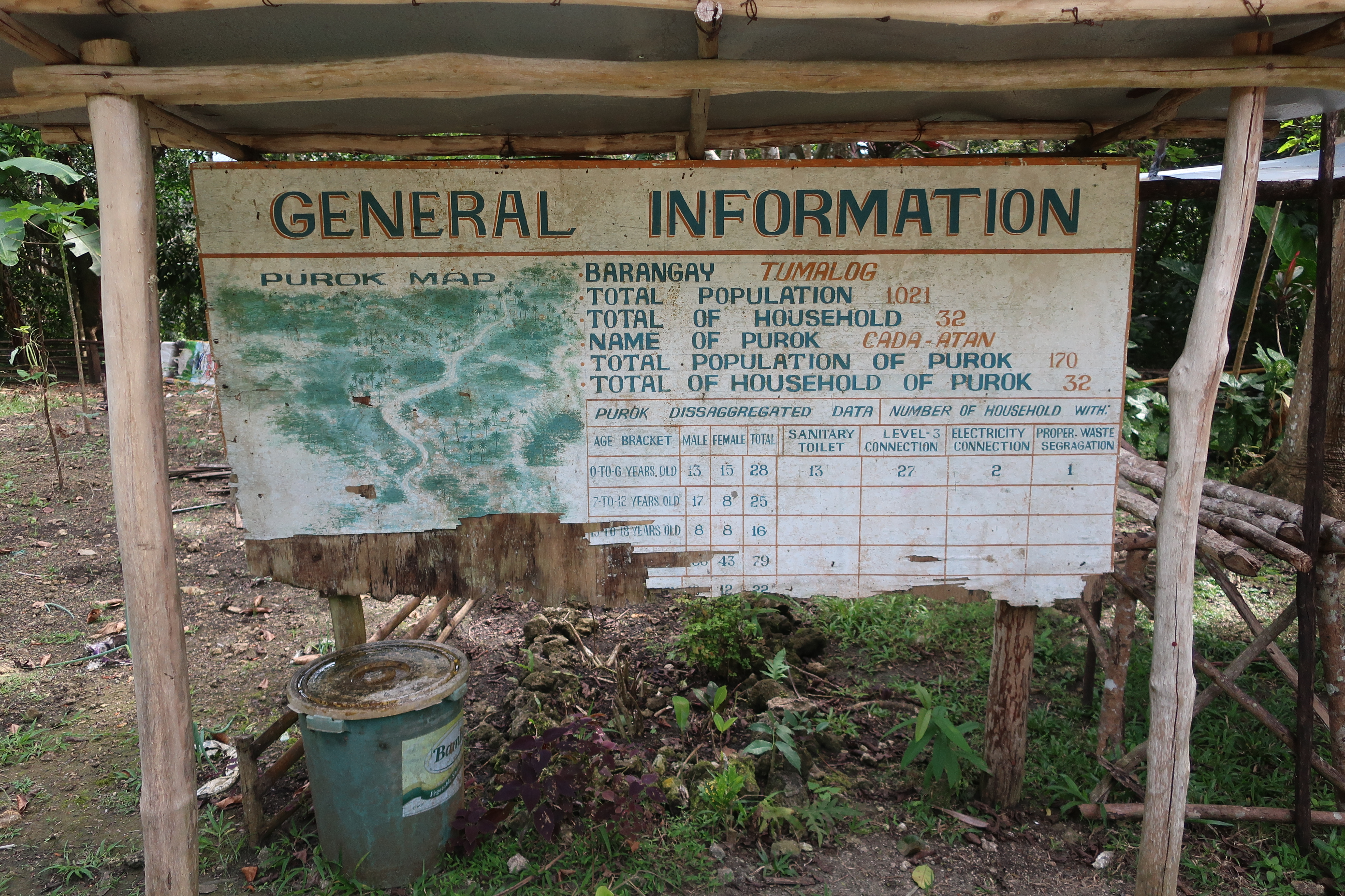 Den mindste administrative enhed i Filippinerne er en barangay, og det lader til, at de løfter en masse opgaver som fx organisering af børnevaccinationer, udsmykning i forbindelse med højtider, drift af skoler osv. På vores tur i bjergene kom vi forbi dette skilt, hvor barangay Tumalog har holdt folketælling på et eller andet tidspunkt.