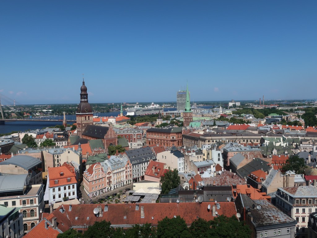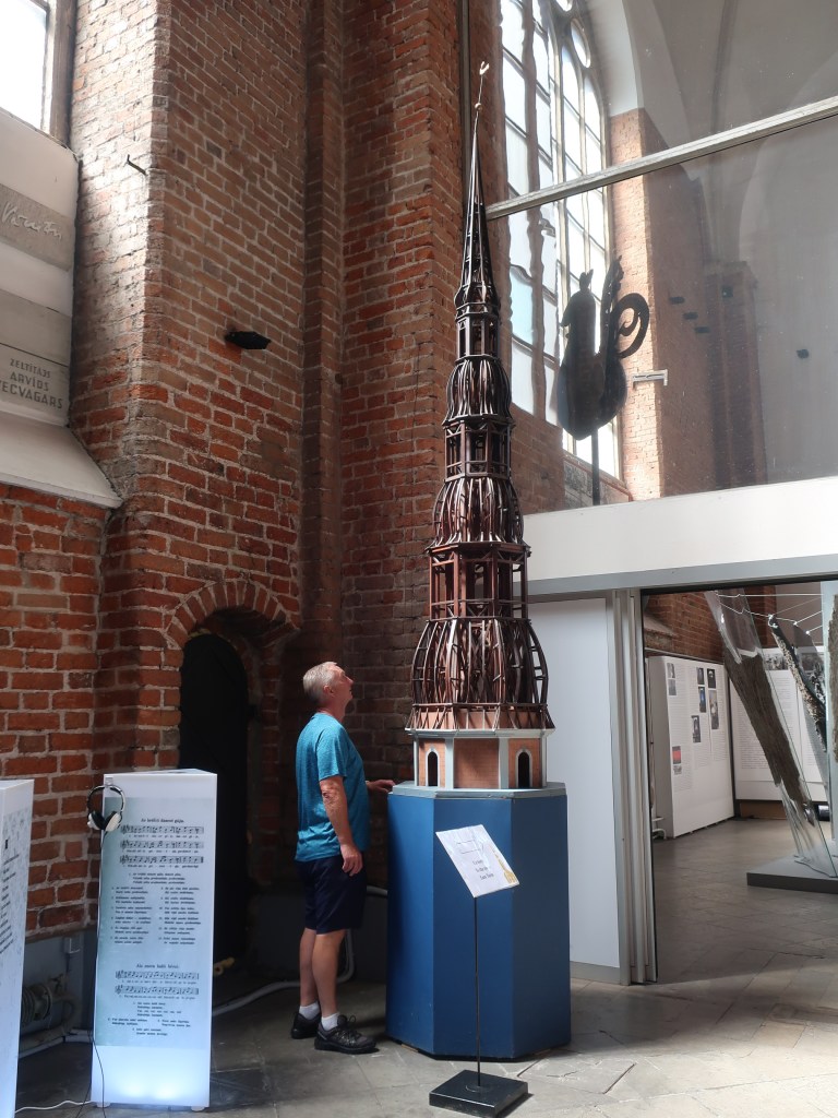 Der ligger et hav af kirker i Riga, men vi nøjedes med at besøge “Peterskirken”, der udover en smuk facade i røde mursten har et enormt tårn i tre niveauer. Det koster €9 pr. person at løse billet til at se kirken og komme op i tårnet. Hvis man kan undvære tårnet, koster besøget kun €4. Som så mange andre bygninger i Rigas centrum har kirken været ødelagt flere gange, dels af bombninger i forbindelse med krig og dels af brande. Da kirken sidst blev genopført, blev der lavet et elevator op til tårnets nederste niveau, så man får altså ikke fornøjelsen af en masse trappetrin, når man skal derop. Til gengæld må man pænt vente i kø på at blive fragtet 8 personer ad gangen i en meget adstadig elevator.