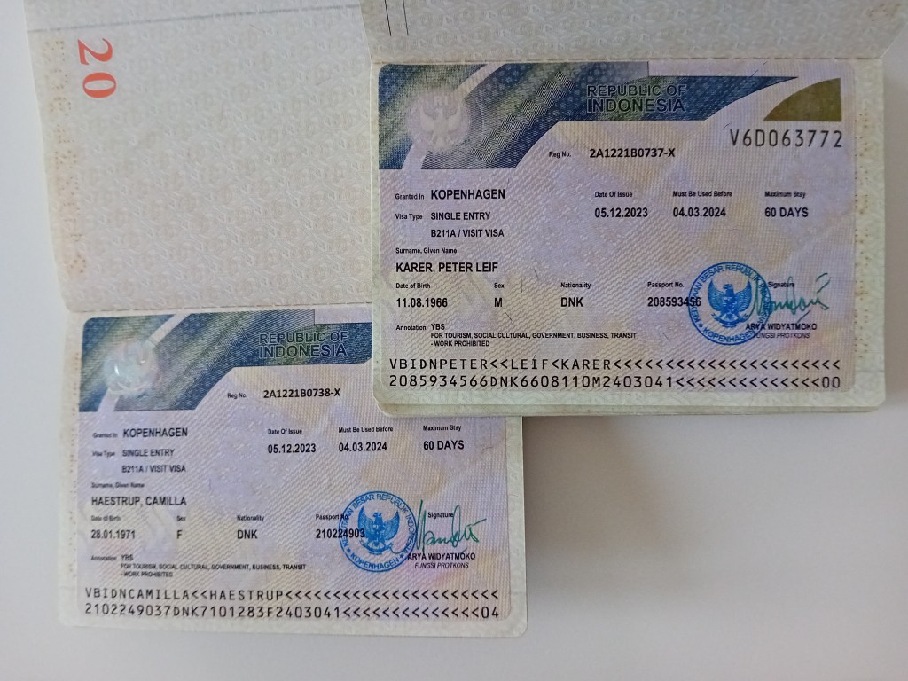 Det koster kr. 750,- at få lavet et visum på den indonesiske ambassade, og det tager 14 dage, hvor man så må undvære sit pas. Det er også muligt at få lavet visum, når man lander i Indonesien, men hvem har lyst til at sidde og vente i flere timer i en lufthavn, når man kan klare det hjemmefra?