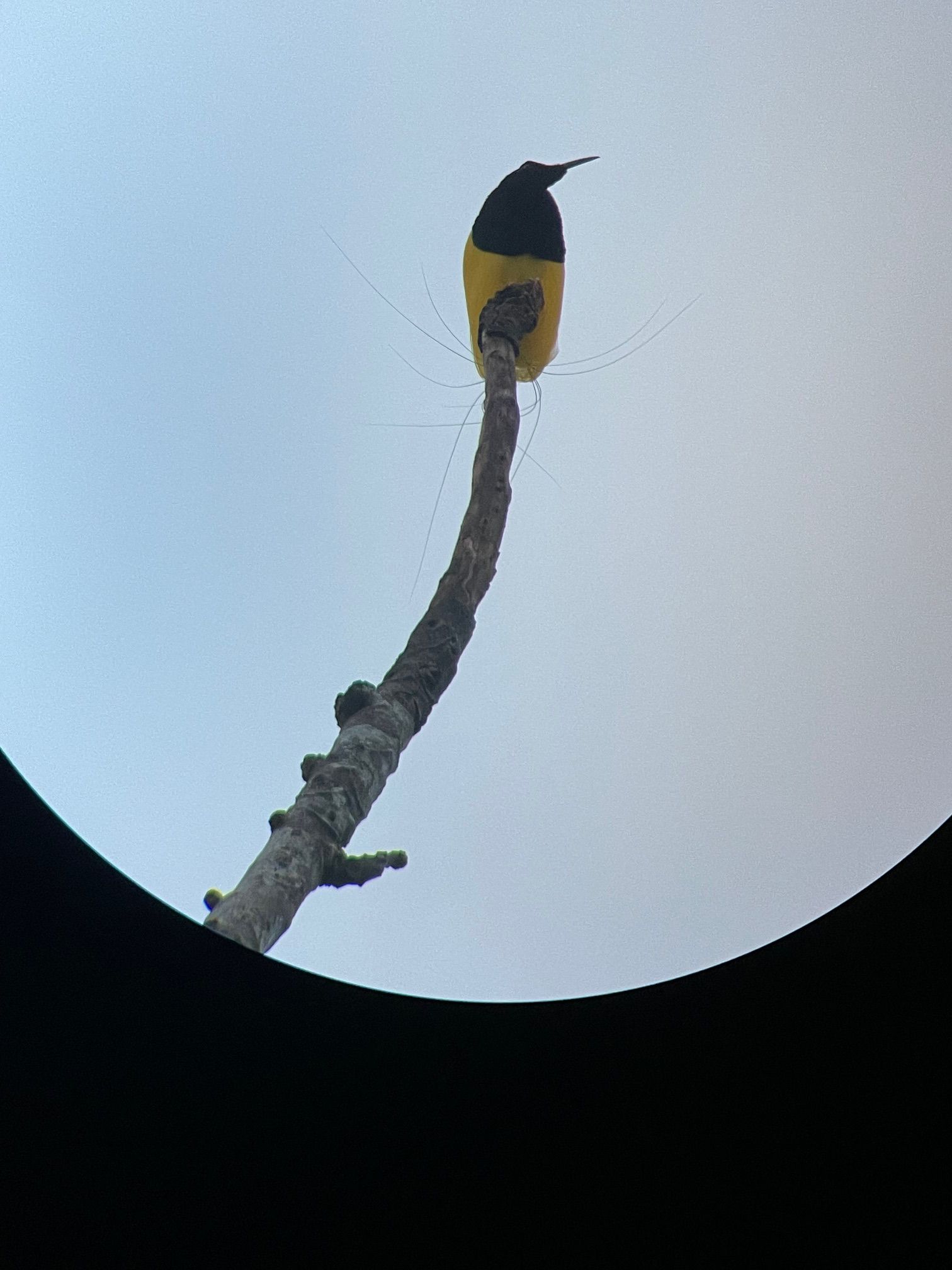Kl. 5:30 om morgenen på anden dagen lykkedes det at spotte denne BoP, der lyder det mundrette artsnavn Twelve-wired Bird of Paradise (Tolvtrådede paradisfugl). De fleste BoP’er har tilsvarende fjollede navne.