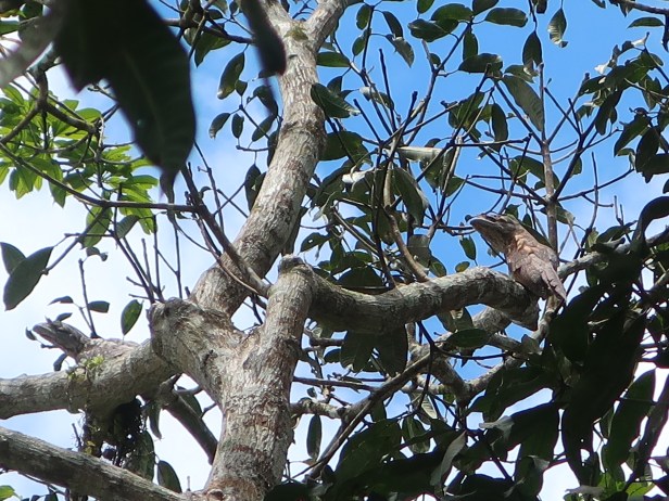 Der er faktisk to fugle på billedet, en til venstre og en til højre, men de er super godt kamufleret og svære at få øje på. Frømundene er nataktive, så vi kunne i ro og mag trampe rundt om træet, hvor dette par og deres unge holdt til. Det gik allerede her op for os, at det irriterende ved at fuglekigge er, at det hele foregår mange meter oppe, og det er sjældent, at man får et rigtig godt kig på fuglen.