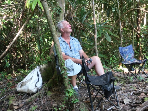 Faktisk foregår langt det meste af tiden på en fugletur på denne måde: nakken lagt godt tilbage, mens man sidder i timevis i tropisk varme dryppende af lige dele sved og myggespray fra Vallensbæk Apotek. Og der er aldrig sikkerhed for at se noget! Denne eftermiddag så vi kun myg.