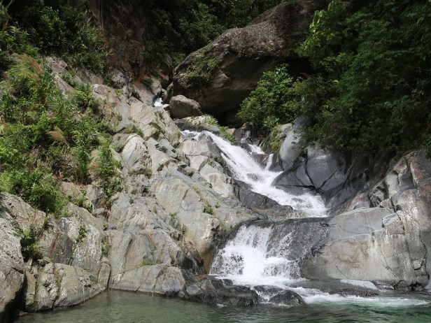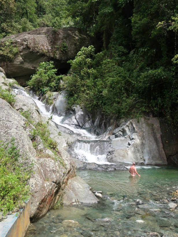 Vandet fra floden blev brugt som drikkevand for landsbyer længere nede ad bjerget, men området ved vandfaldet blev også brugt som rekreativt område for de unge i området. Da vi ankom, var vi heldigvis alene og kunne nyde stilheden – eller så meget stilhed der nu er, når mange m3 vand kommer brusende – og Peter kunne få klatresveden skyllet af kroppen.